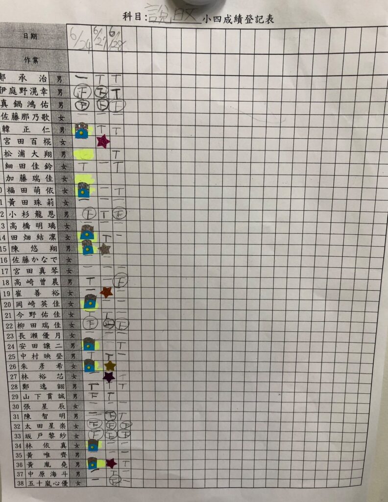 3.最近班上講日文狀況越來越嚴重,老師請說中文長每天記錄,每天大概只有六個小朋友可以得到貼紙,請同學們要努力,把說中文的習慣延續下去。