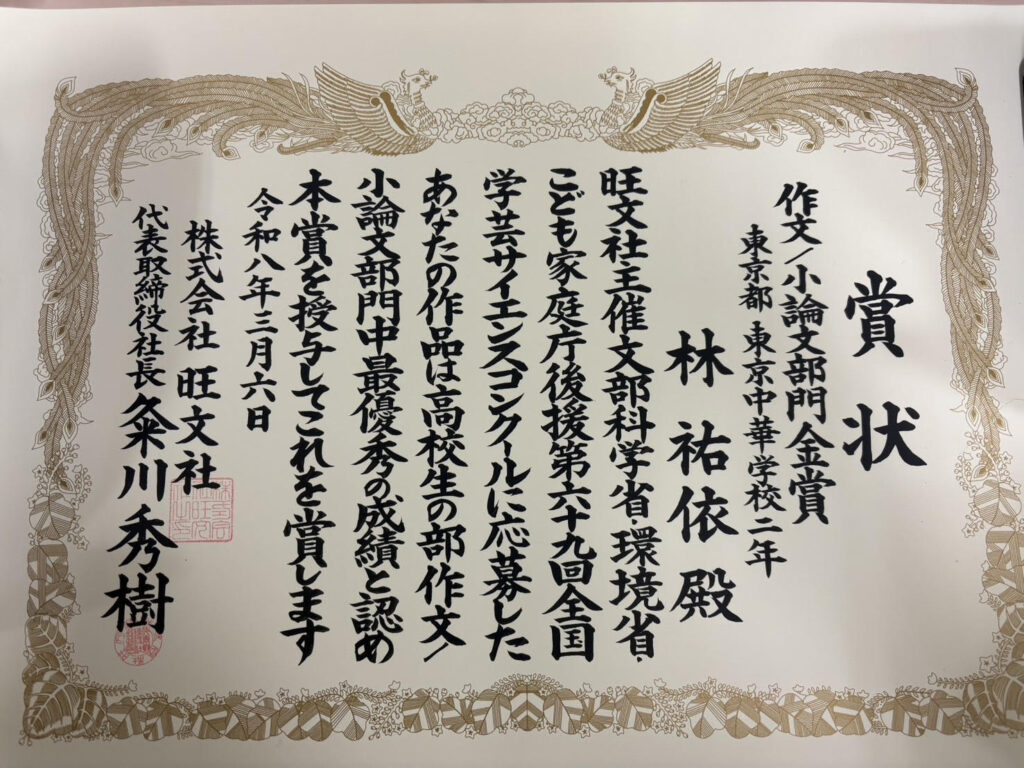 第69回全国学芸サイエンスコンクール(主催:旺文社、後援:文部科学省・環境省・こども家庭庁)作文/小論文部門において、本校の林 佑依さん(高校2年生)の小論文が、高校生の部金賞(同部門の作品中、最も優れたものに贈られる賞)を受賞しました。