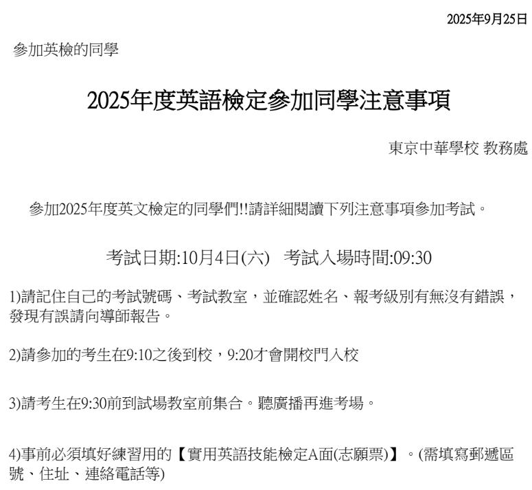 1.10/4(六)有參加英檢同學,請家長仔細閱讀考生考試須知。今天會發下練習用志願票(填寫紅色框框的地方,團體番號、受驗地番號、個人番號准考證已印好不需填寫,但須記得自己的准考證號碼),請家長協助填寫後,讓孩子周六帶到考場。