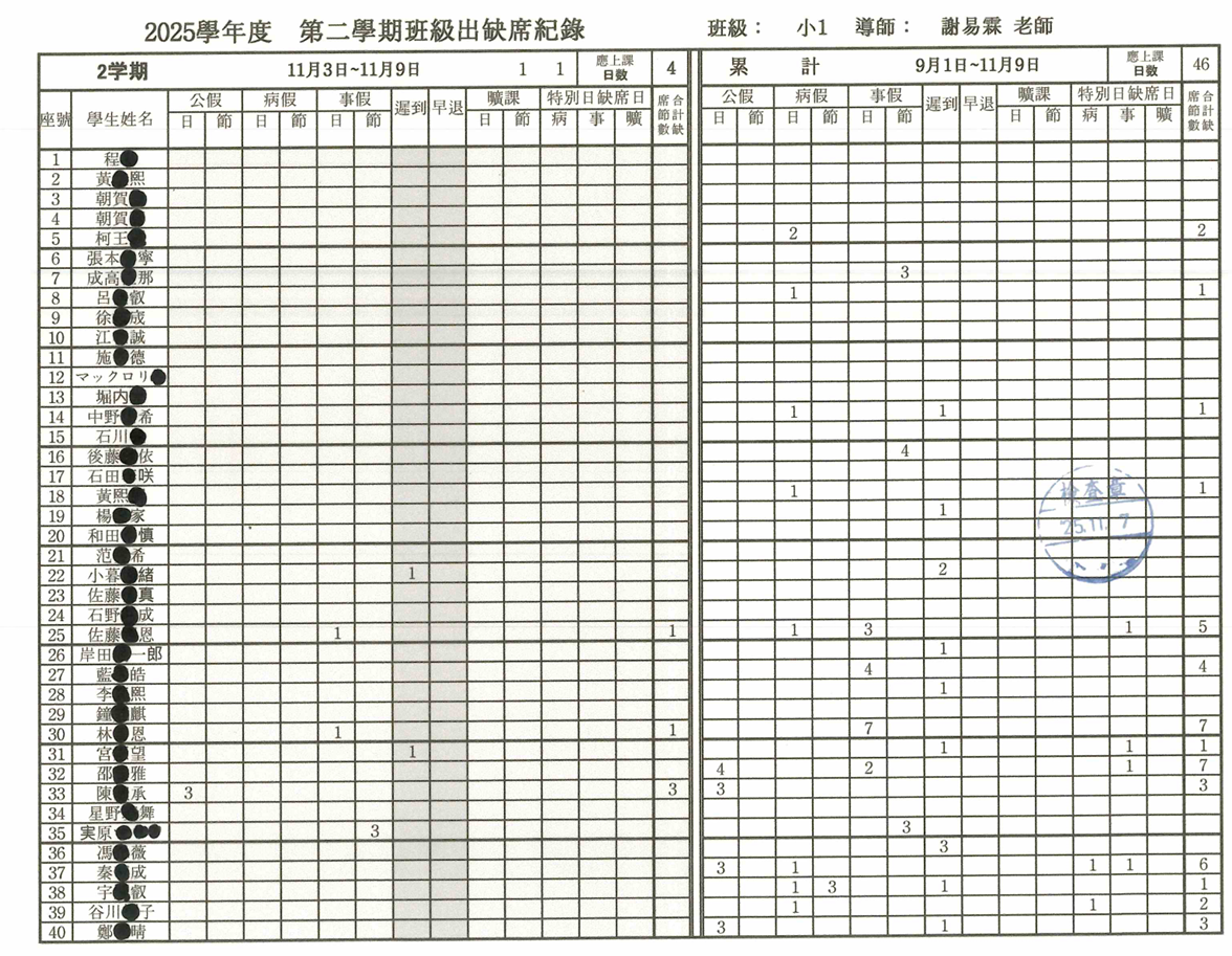 5.上周的出缺席紀錄表,請家長協助確認缺席天數是否錯誤。