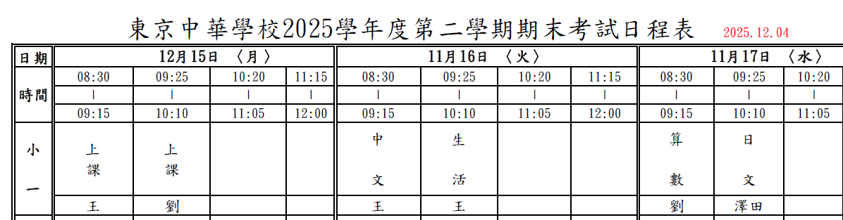 12/15(一)聯絡簿 2025-12-15 作者: 謝 易霖 注意事項 1.今天英會話補考沒過的小朋友,禮拜四再補考一次。 2.明天是期末考,請小朋友準時到學校應考,記得帶直尺、色鉛筆。 缺交作業 1.圈詞考卷:11、34 2.中L1-L6複習卷:11 3.中L6卷(有分數的):24、17 4.中L6作業卷:17 5.數L4卷:11、12、4、32、33 6.紅白帽:32