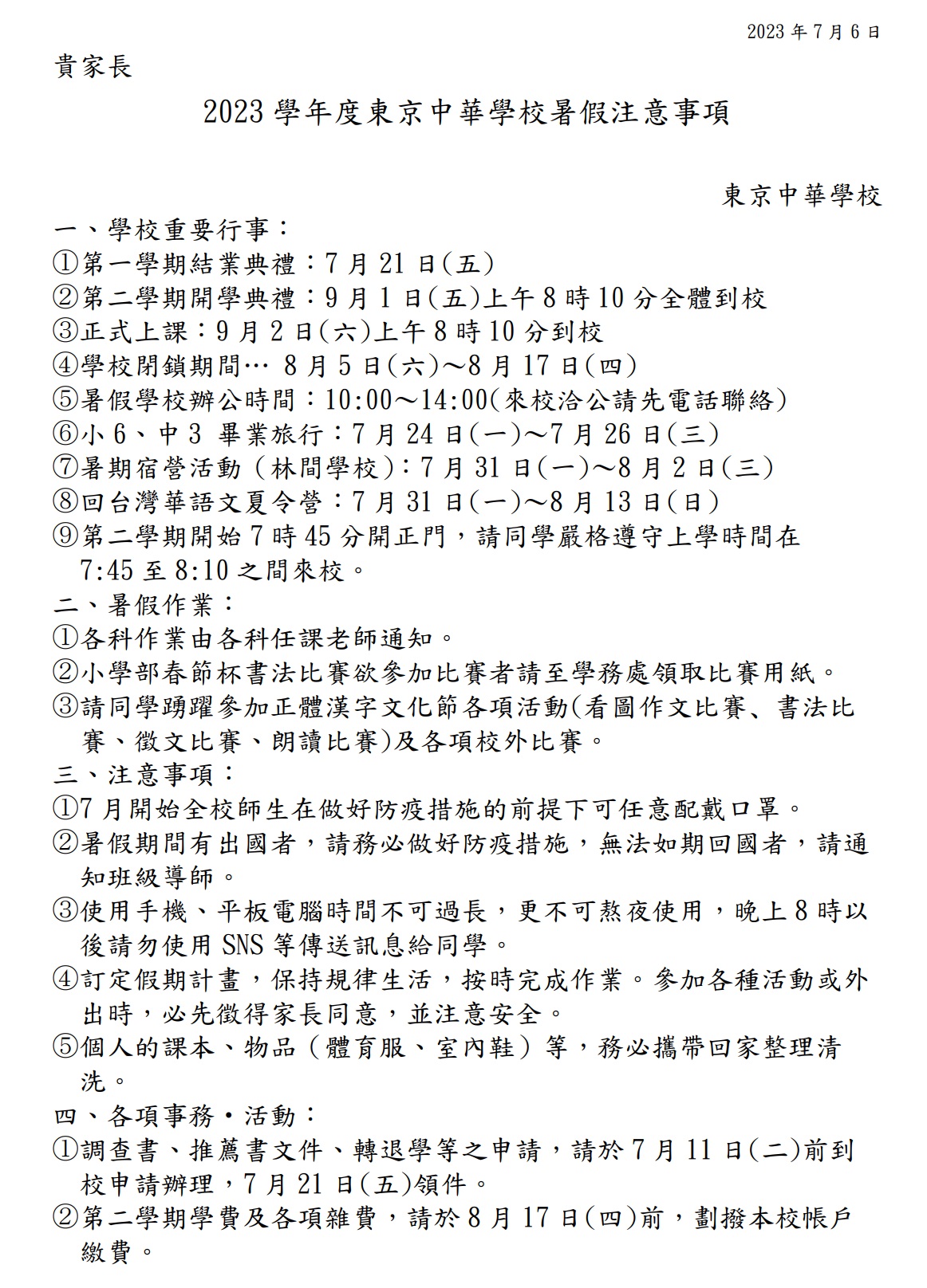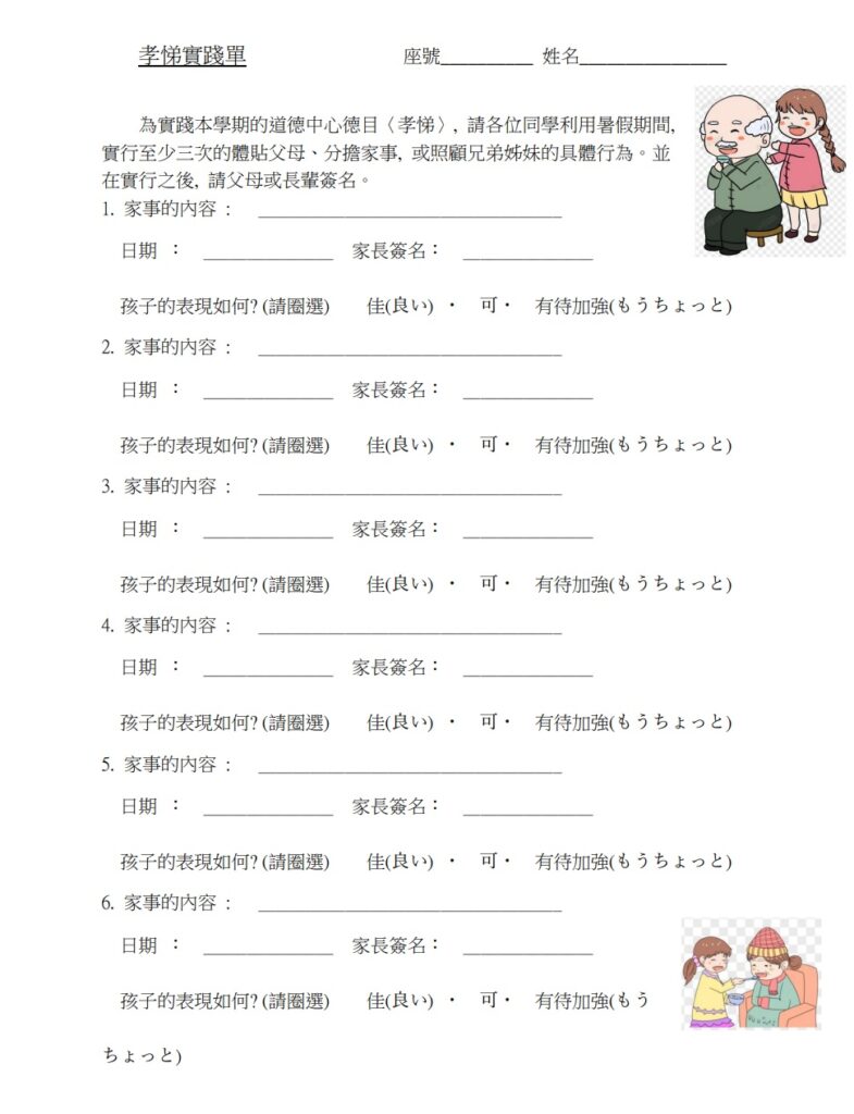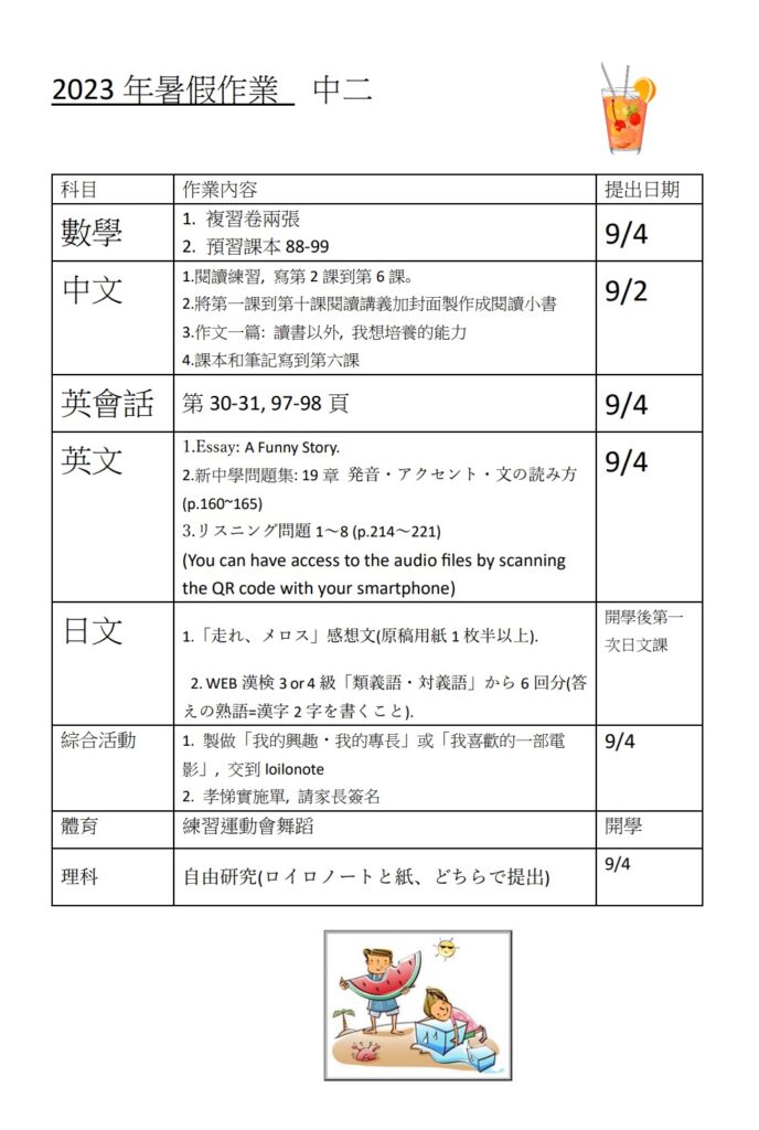 - 準時在暑假期間完成所有暑假作業。
