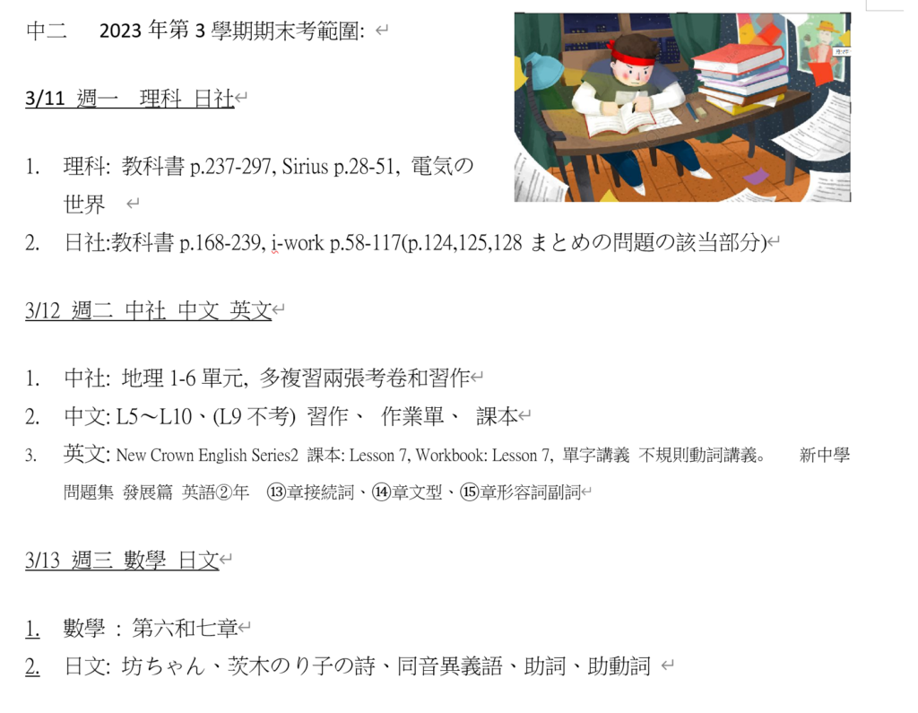 - 日文作文未交: 4, 22. 清書未交: 9, 11, 12, 19, 21, 24
