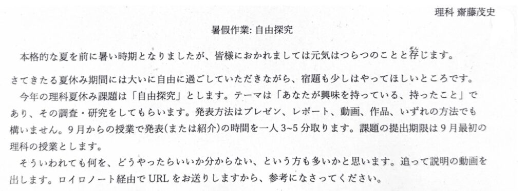 - 美術:「アートレポーターに挑戦!」(アート作品の写真を添えてプリントを提出してください。ロイロノート提出箱への提出でも大丈夫です)