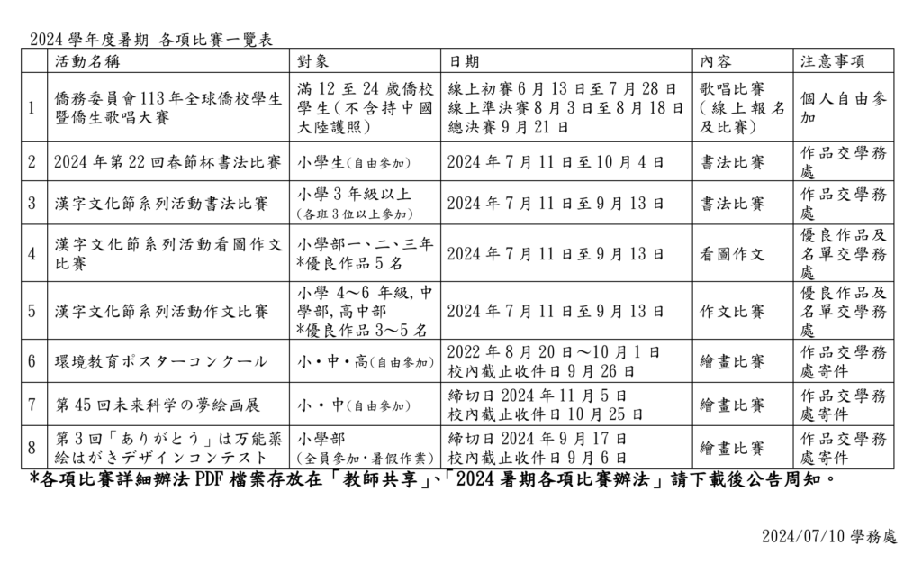 7月10日週三聯絡簿(含暑期各項比賽辦法)