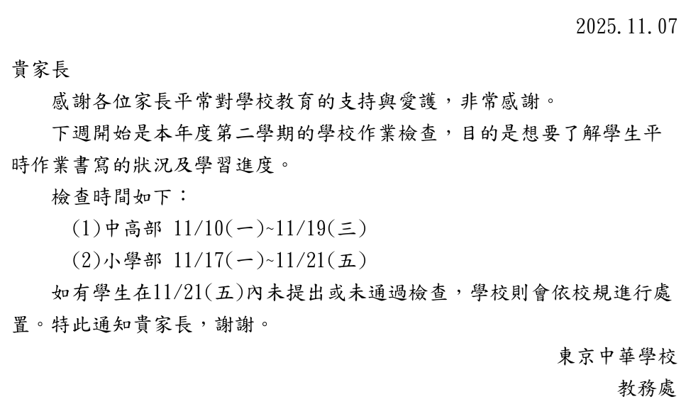 11月7日週五聯絡簿(含作業抽查通知)