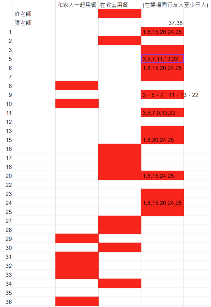 同學問卷:https://docs.google.com/spreadsheets/d/1L4WMg31Vx6in-zNFreI_YkqPQJmR2COhrZ8_Nlihdo4/edit#gid=0剩下12位家長尚未填寫問卷,再麻煩家長撥空填寫